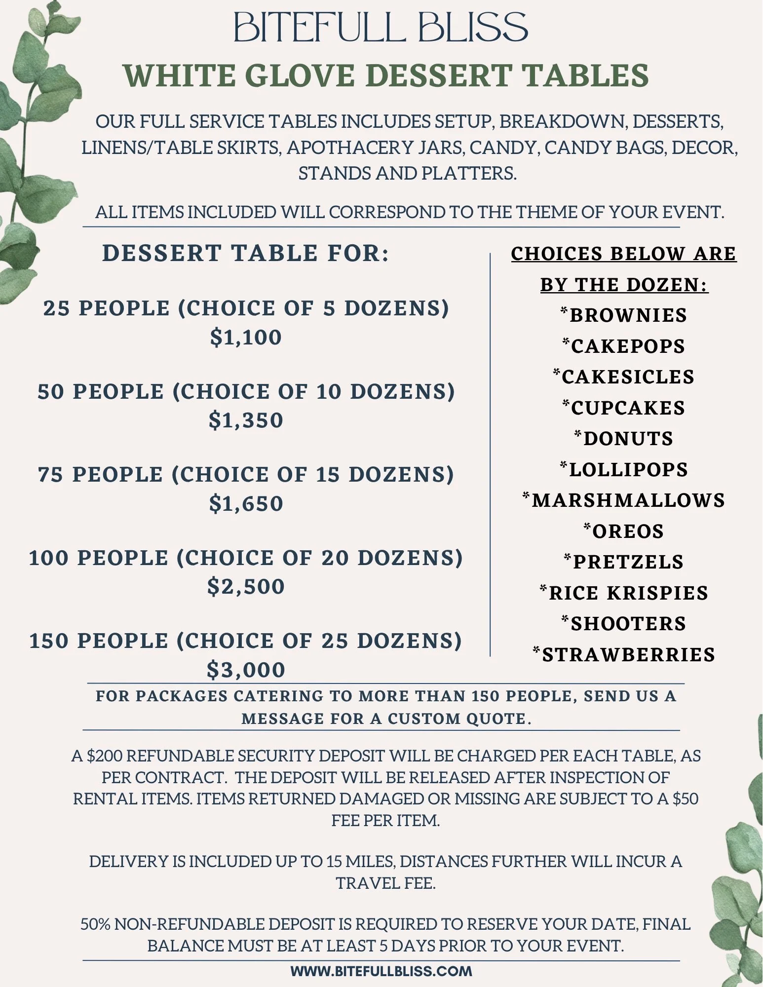 Our white glove dessert tables, on average, range between $1,100-$3,000 - depending on the size of your event!